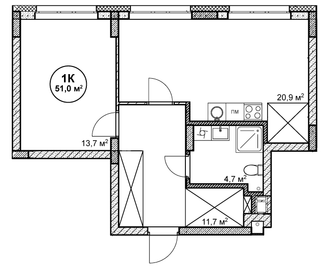 1-комнатная квартира № 68